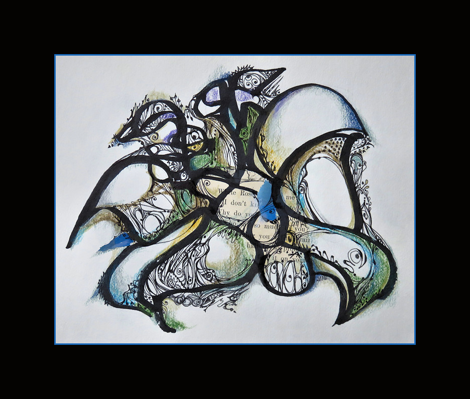 Back to the 8 x 10" sketchbook, this drawing's color comes from acrylic paint and collage. I used various pens for the ink. When the color was established I found the bit of word list in my mother's elementary reader and immediately knew it was meant for this image and its title. Strangely, though it is much smaller, it reminds me a bit of an earlier drawing, "Somebody's Mother." This should really be a lot of fun for you! See where it takes you.